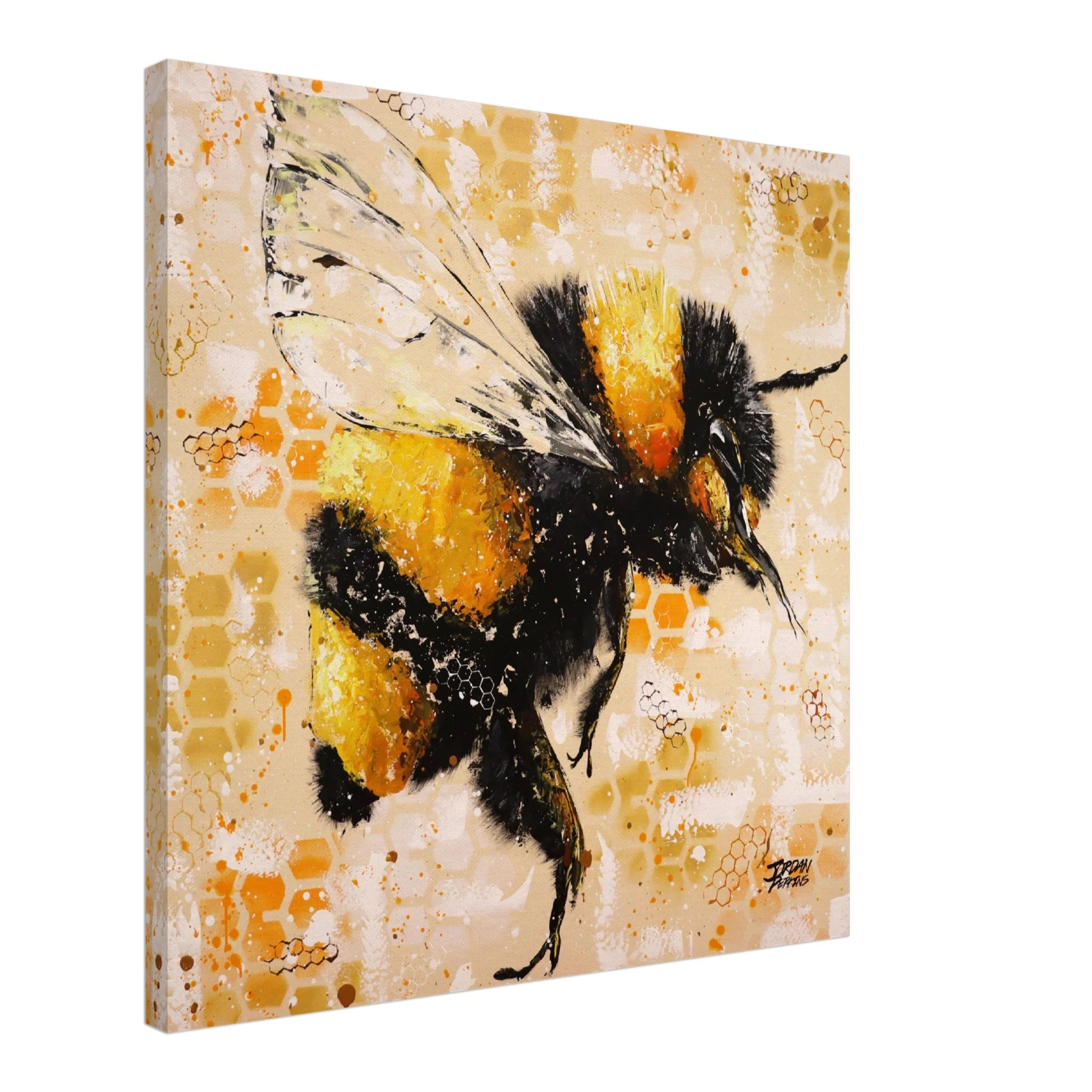 This Buzz to the Right Canvas Print featuring a bumble bee buzzing to the right is a delightful expression of modern art rendered from an original painting. Its soft hues and fuzzy bees create a sophisticated atmosphere, making it a perfect addition to any exquisite interior.